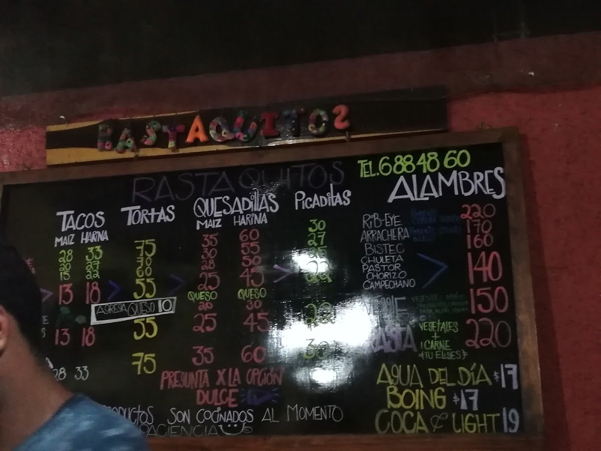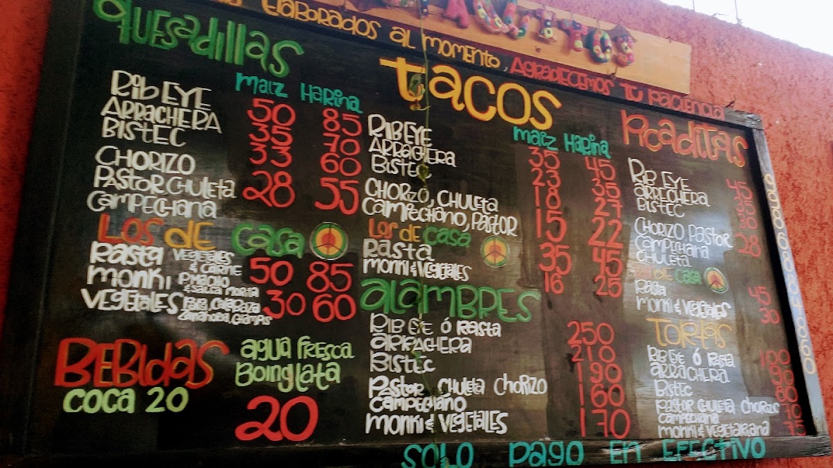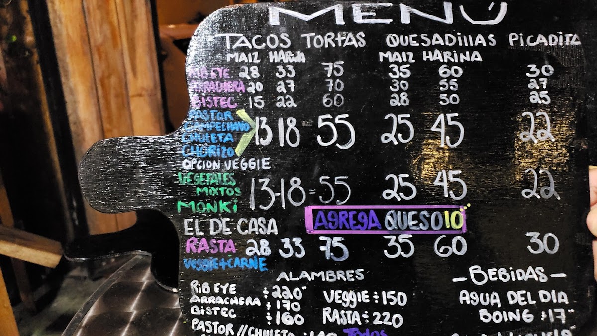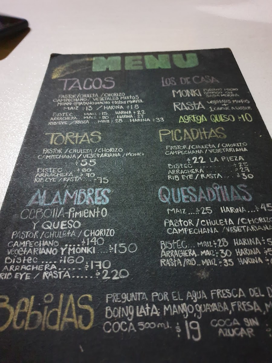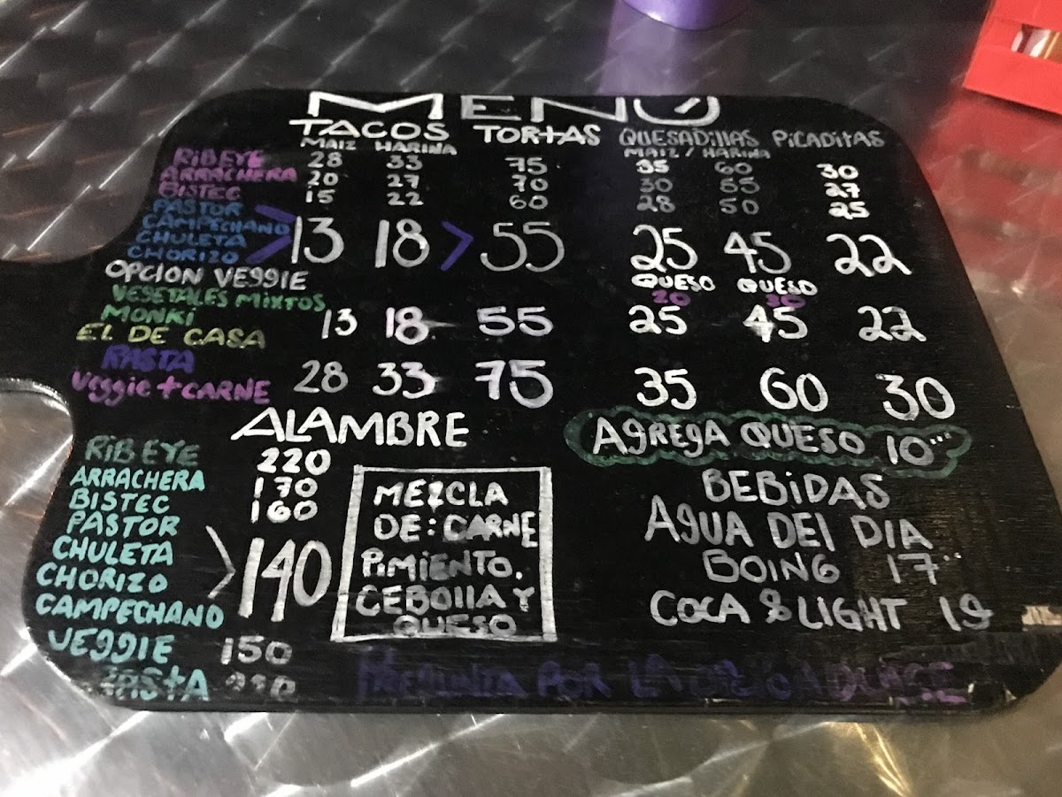 Rib eye / Rasta (+carne) - Arrachera - Bistec - Pastor - Chorizo - Chuleta - Campechana - Monki / vegetales mixtos -